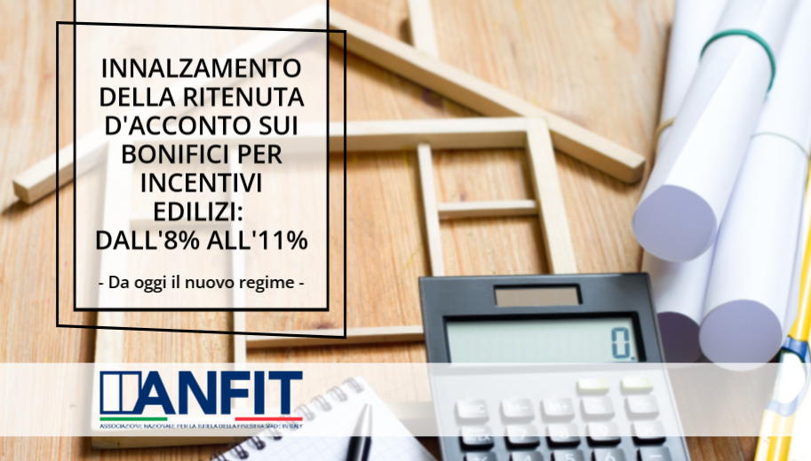 Da oggi, 01 Marzo 2024, cambia l’aliquota della ritenuta di acconto sui bonifici per incentivi fiscali in edilizia e passa dall’8% all’11%.