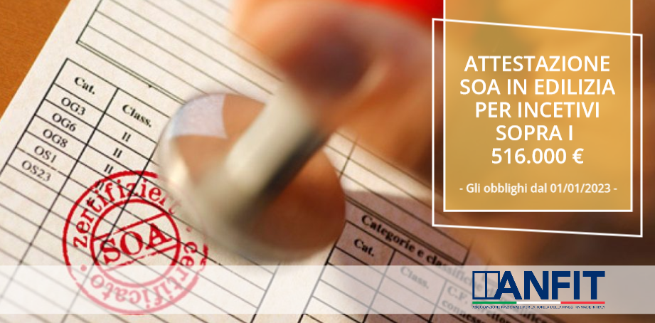 Dal 01/01/2023 entra in vigore l’obbligo di attestazione SOA per le imprese che operano su commesse superiori a 516.000 € soggette a incentivi.